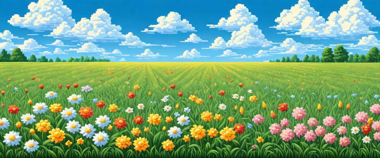 Prompt: grass field full of flowers, blue sky, big clouds, golden ratio
