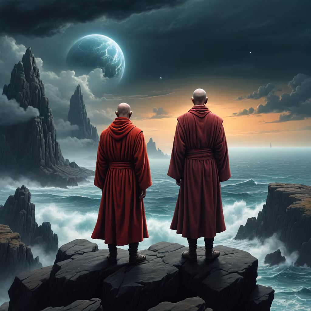 Prompt: A classic sci-fi futuristic monk dressed in vibranium monastic garb, looking towards the horizon on an exoplanet, standing on a cliff, facing an infinite seascape and dramatic sky, inspired by The Monk by the sea by Caspar David Friedrich and inspired by the colour illustrations of Gustave Doré.