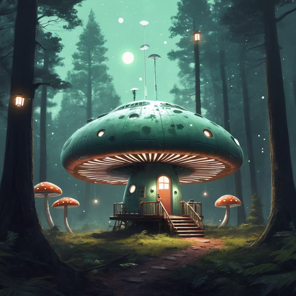 Prompt: a retro spaceship, shaped like a mushroom, with a mint green cap and white dots, in a forest, with glowing lanterns and a cabin, digital art, by Jakub Rozalski, Star Wars, HD, realistic, sci-fi, fantasy, cool