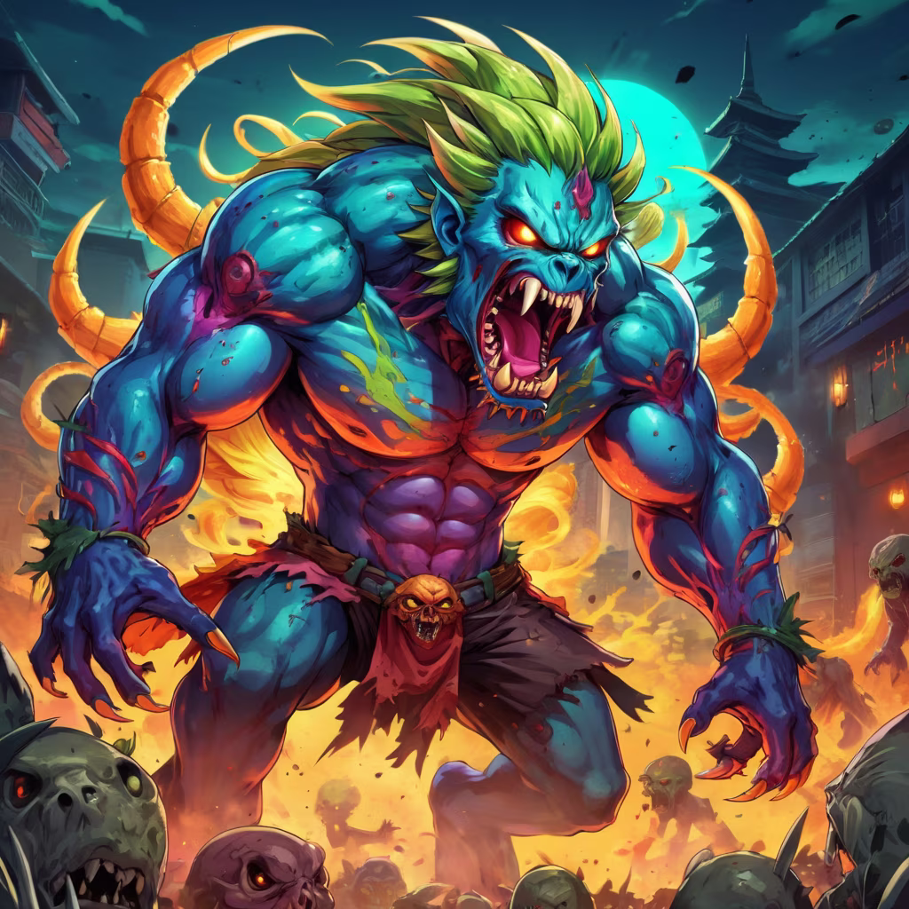 Prompt: A giant zombified creature running towards a man whose facial expression is terrified by it and is running for his life
