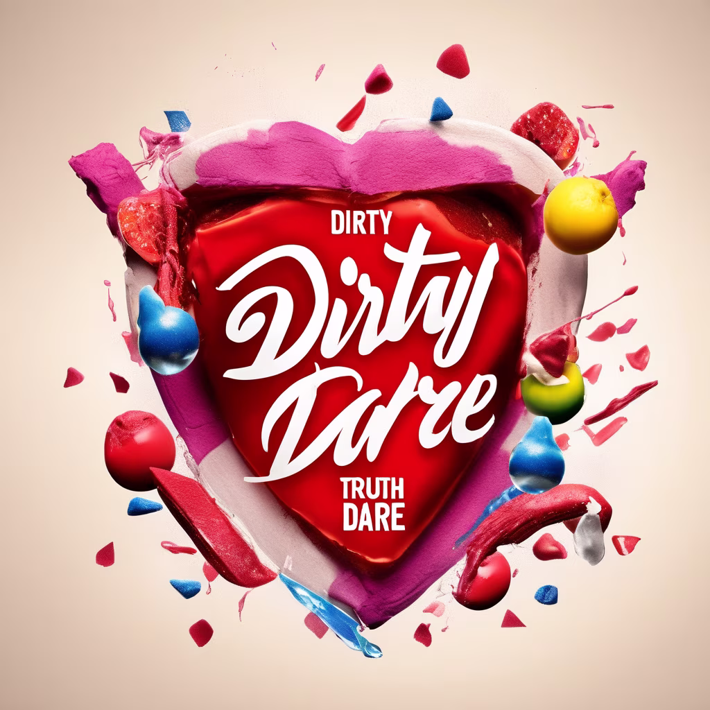 Prompt: a bold advertising image for \"Dirty Truth or Dare\" using striking typography and suggestive visuals to showcase the game's daring challenges. Capture the essence of increased intimacy in relationships with a modern aesthetic, featuring a diverse and enthusiastic couple surrounded by elements of excitement and connection.