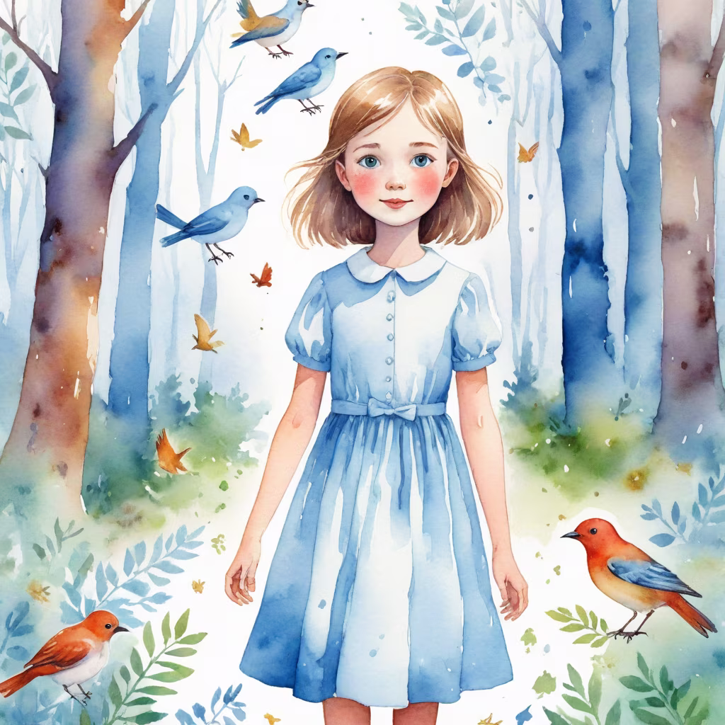 Prompt: Pale blue watercolor,Children's Book,a younggirl standing in a forest, surrounded byseveral bird. She is wearing a white dressand appears to be enjoving her time innature. The bird are scattered around he