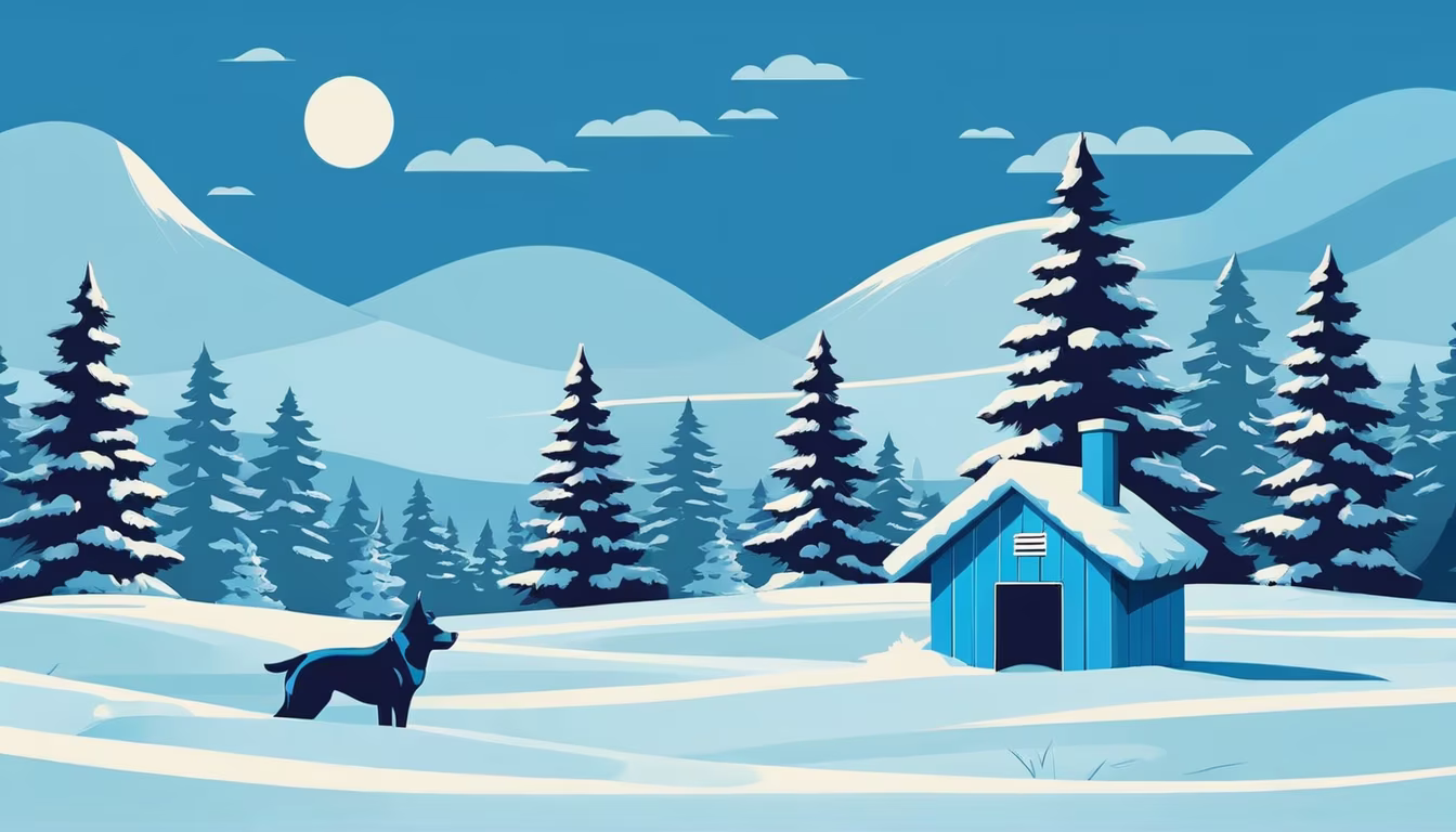 Prompt: A minimalistic illustration of a snowy winter landscape with a blue doghouse and evergreen trees