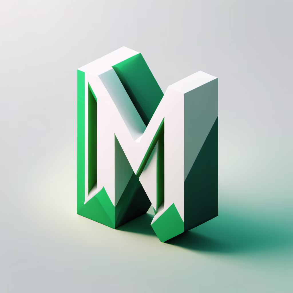 Prompt: logo wih the letter M embedded into two blocks, green and white colours, silhouette, fine lines, detailed, modern, glow
