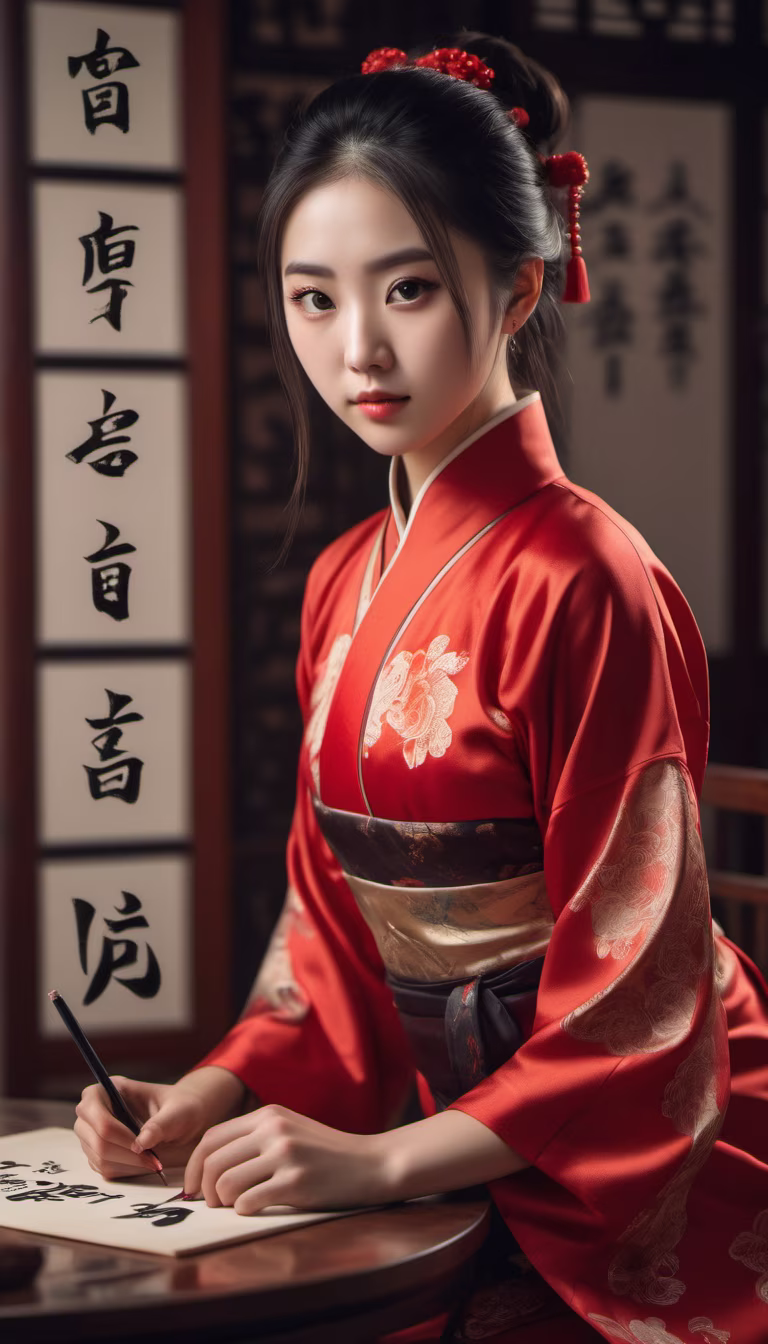 Prompt: A sexy and beautiful 25 year old Chinese girl with round and big eyes, wearing a red Tang dress and fair skin, sitting on a table writing Chinese calligraphy, facing the camera.Antique Tang Dynasty decorative style, 8K, realistic.
