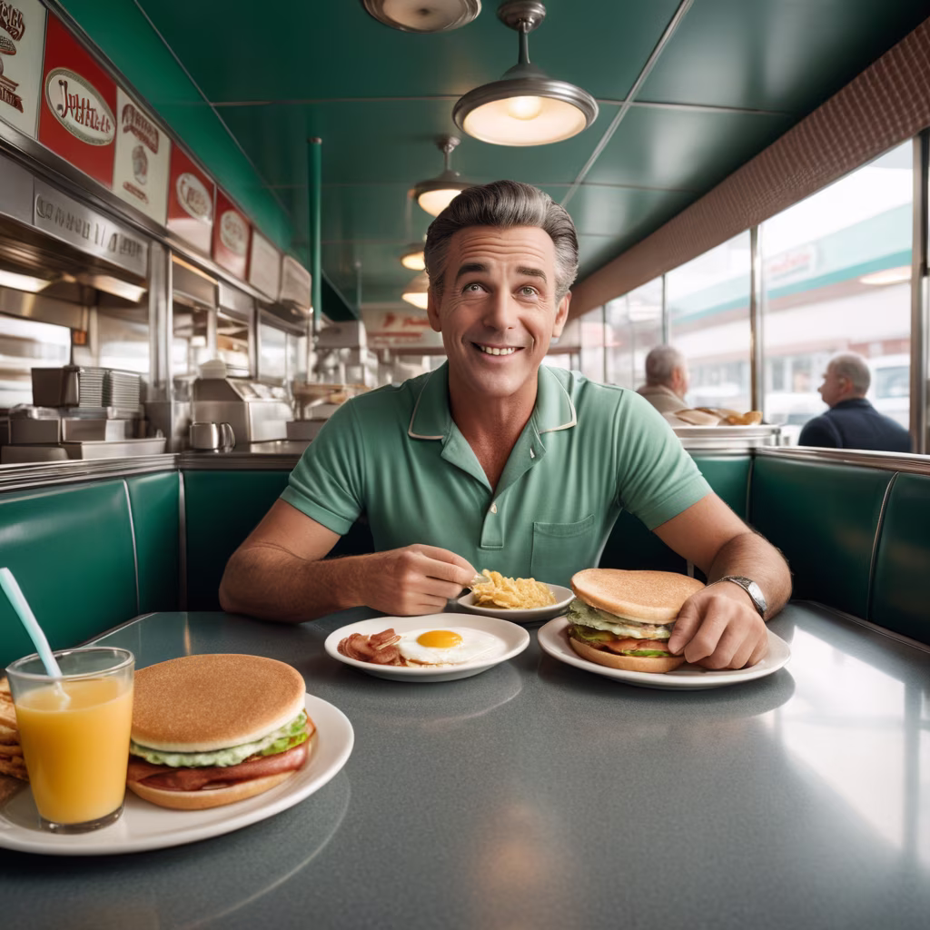 Prompt: a Wide-angle portrait of a man eating breakfast in a diner, in the style of dadaist photomontage, grocery art, monumental scale, subtle use of color, gray and green, grandparentcore, interior scenes, Analogue photography. leica m6, kodak portra