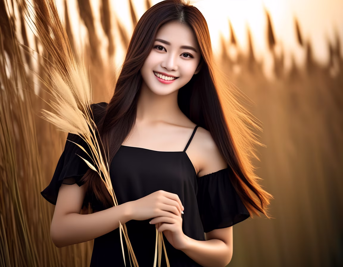 Prompt: Taiwanese girl with long hair wearing a black short dress, surrounded by reed grass::1, holding a bunch of reed grass in her hand, smiling at the camera with a side profile, gentle breeze caressing her, afternoon, front lighting ,(masterpiece,best quality,8k,HDR,RAW),