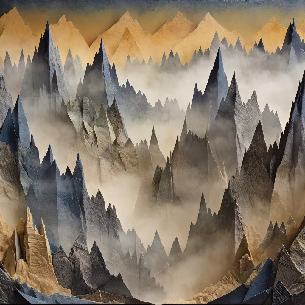 Prompt: Panorama of jagged peaks \u0026 valleys shrouded in morning mist as first rays pierce through - mixed media collage incorporating various textures such as sandpaper, fabric, \u0026 glossy paper elements to bring physical dimension