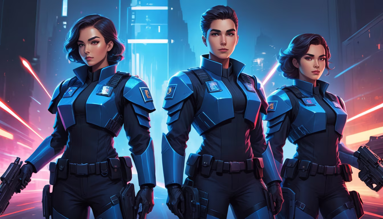 Prompt: Two twins, they are police officers in a distant future, they have a super sexy outfit of different colors behind them a huge armored vehicle. They are fond of laser blasters.