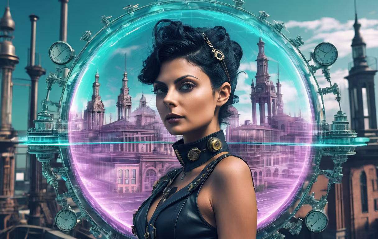 Prompt: time wizard morena baccarin, double exposure effect, timestream overlap steampunk-gothic industrial-city, overlap utopian-vaporwave floating-city; 6k volumetric octane render
