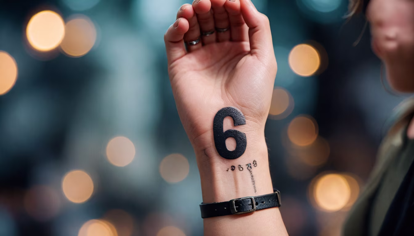 Prompt: a girl hand with number 058 as tattoo on her wrist, close up