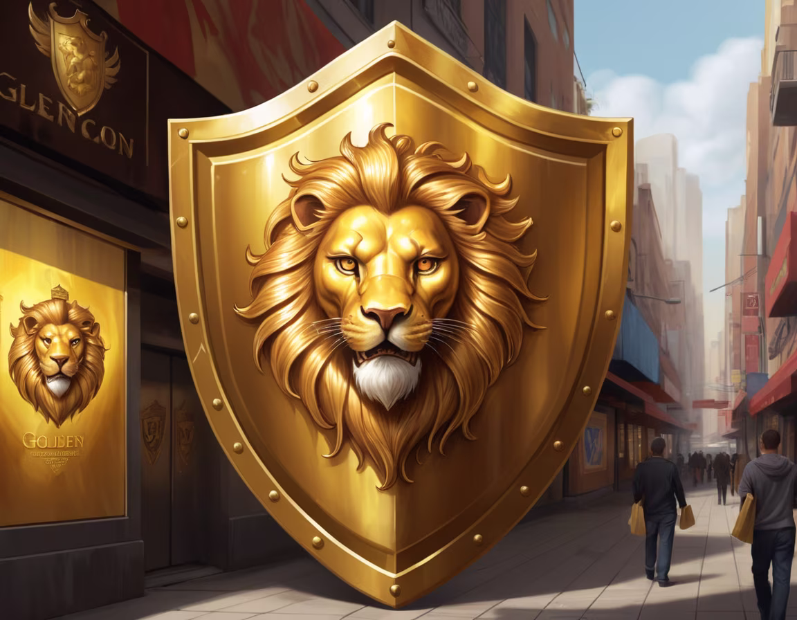 Prompt: Generate a golden lion shield logo and generate usage scenarios, such as packaging bags, containers, and shopping malls.