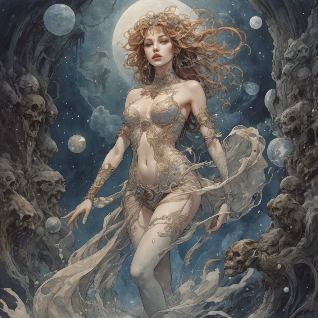 Prompt: (Katsuya Terada's style surreal art, psychedelic art, luminous and enchanting, watercolor effect concept art of Niv, SYLVIA KRISTEL, Adobe Illustrator) Guided by unseen forces, she descends into the earth's core, where she encounters the spirits of her ancestors. They appear as wispy figures, their bodies woven from stardust and moonlight. They dance and chant ancient songs, their voices echoing through the cavernous depths, connecting her to her lineage and heritage.