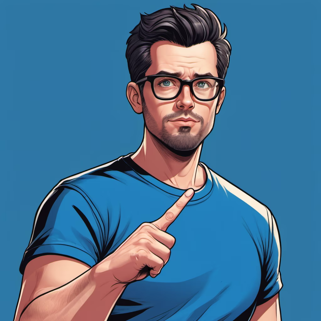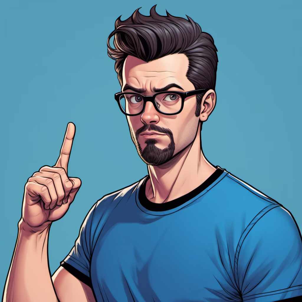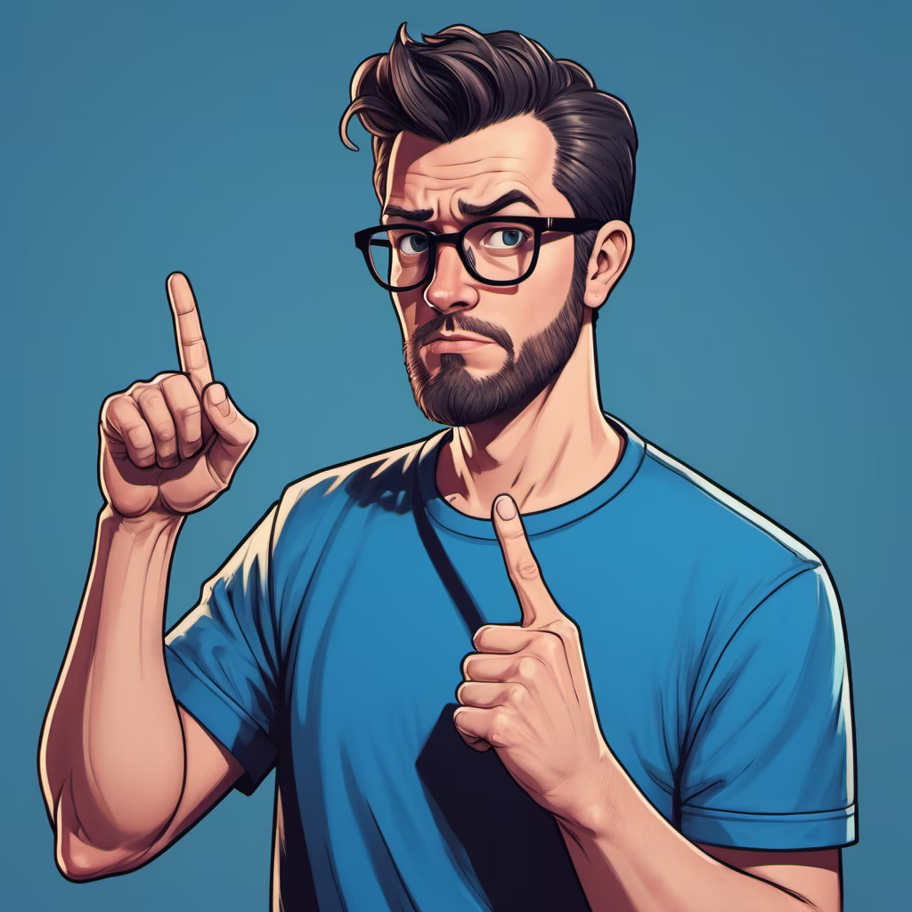 Prompt: Design a character with an attentive expression and raising a finger , 35-year-old white male with dark brown hair, a small pompadour, a light beard, and wearing black-framed glasses. with blue tshirt