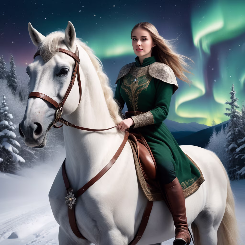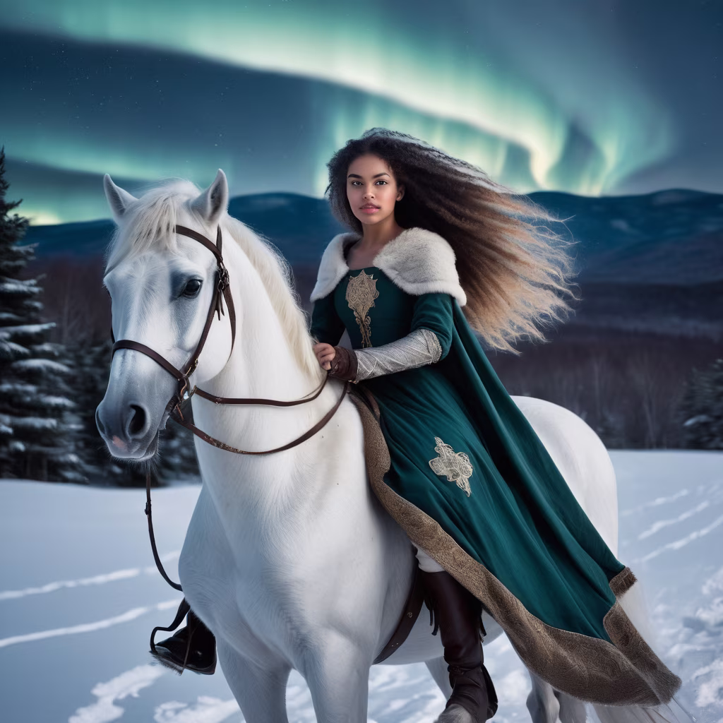 Prompt: A medieval beautiful young woman wearing a medieval style and riding a white horse with Aurora Borealis at winter night in Mont-Tremblant National Park. Classical, photography