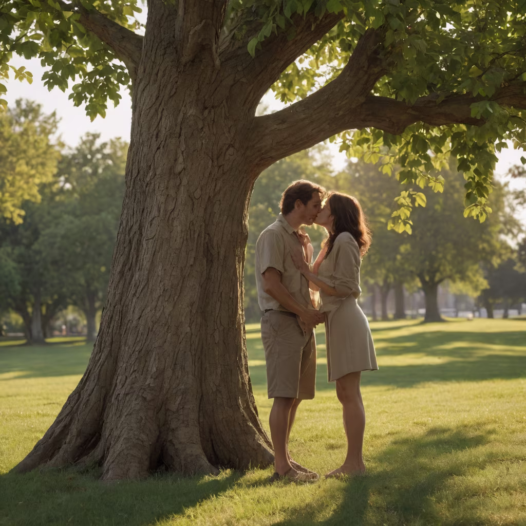 Prompt: Couple almost kissing under a leafy tree, in the late afternoon. Highly detailed, hyperrealistic.