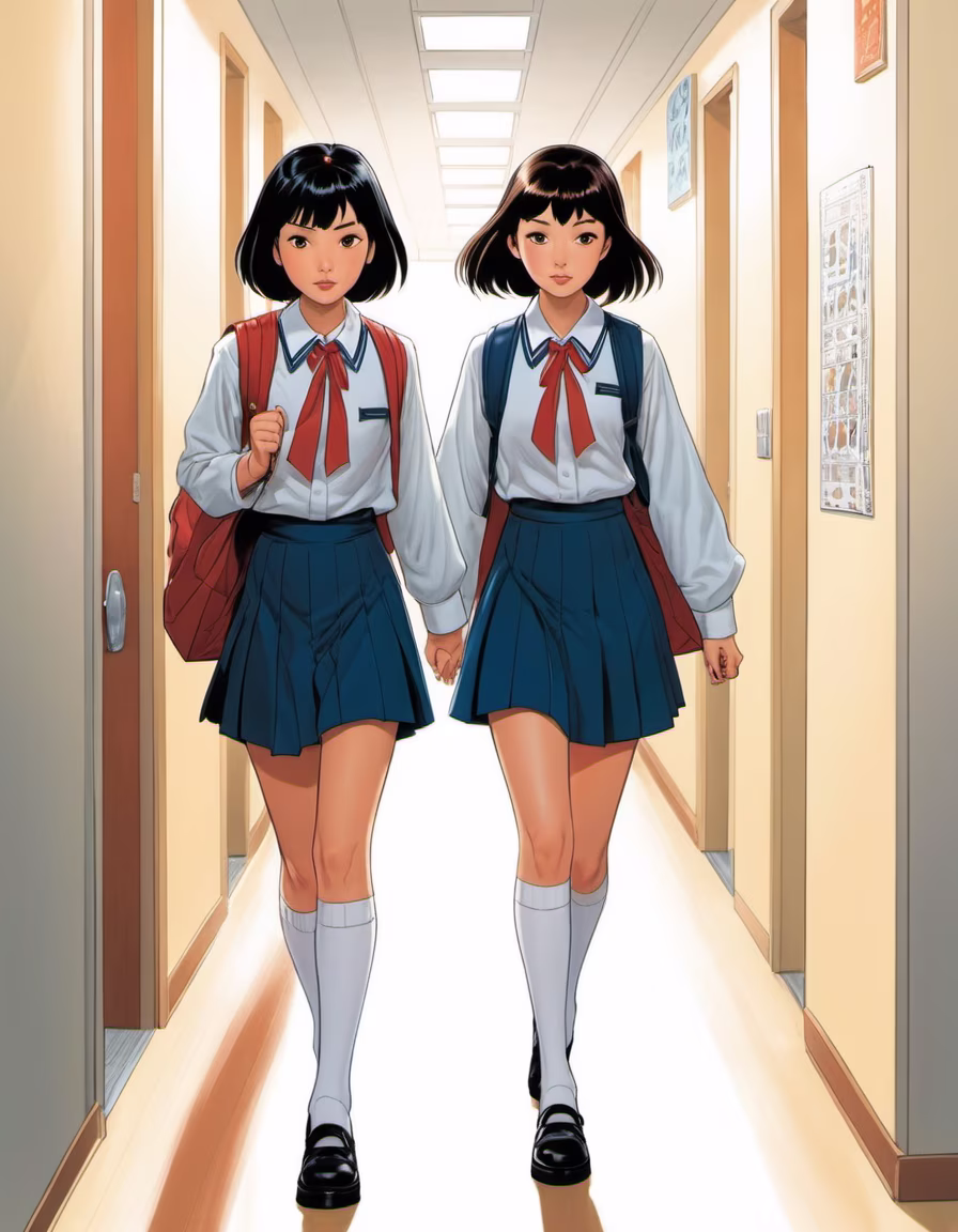 Prompt: Eunha with black short hair wearing a school uniform and 16 year old Mariko Shinoda with a short pony tail brown hair grey eyes wearing a school uniform walking in the school corridor in the style of Alex Ross