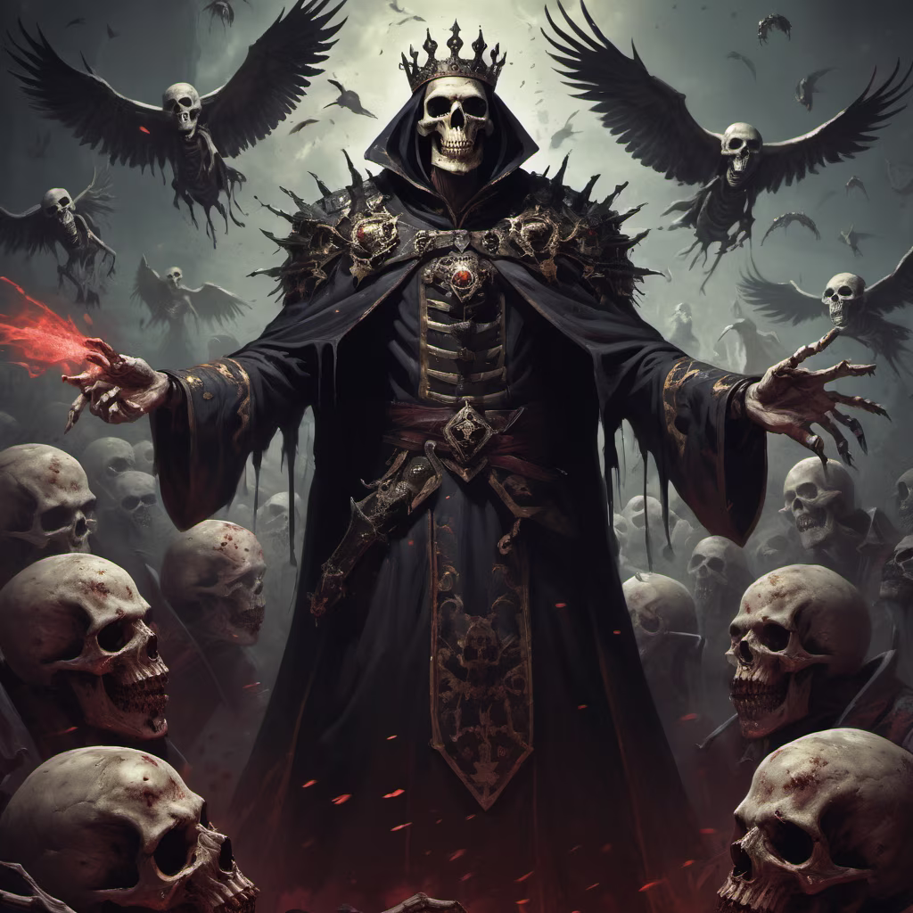 Prompt: A necromancer with the power to control swarms of undead creatures. The Carrion King raises armies of zombies, skeletons, and other macabre entities to do their bidding, spreading fear and death wherever they go, highly conceptual image, work of art
