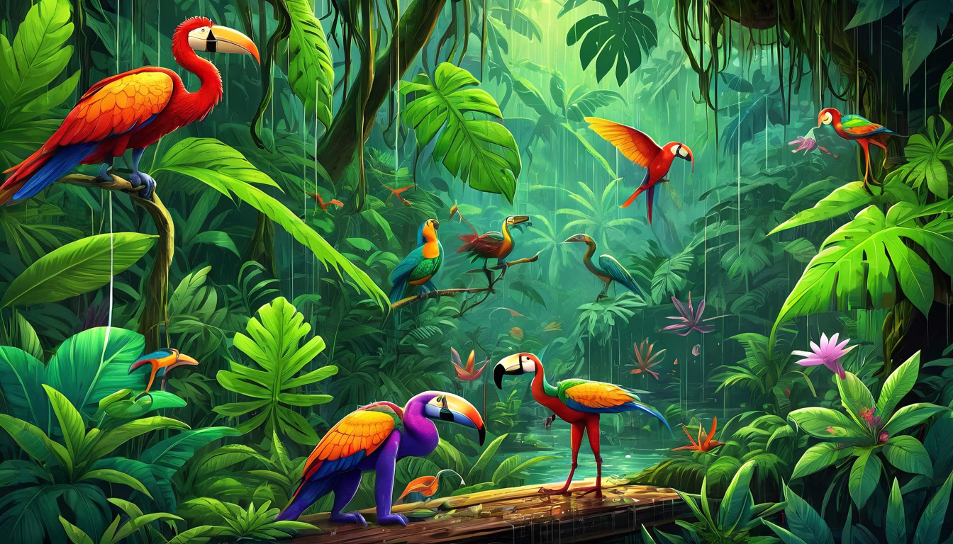 Prompt: raining tropical rainforest secret location where everyone smokes weed cannabis ganja buds beautiful amazing award winning photo with a lot of animals 🐢🦕🦎🐠🦈🐳🐬