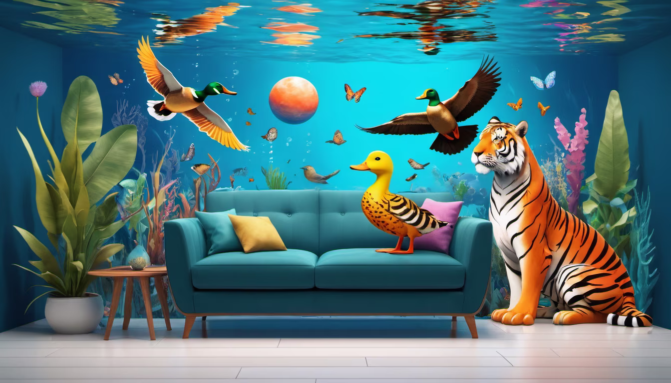 Prompt: a simple happy duck next to a tiger surreal with birds, butterflies, planets under the water clear ocean water coral reef living room hipsters couches hd 3d 32k amazing