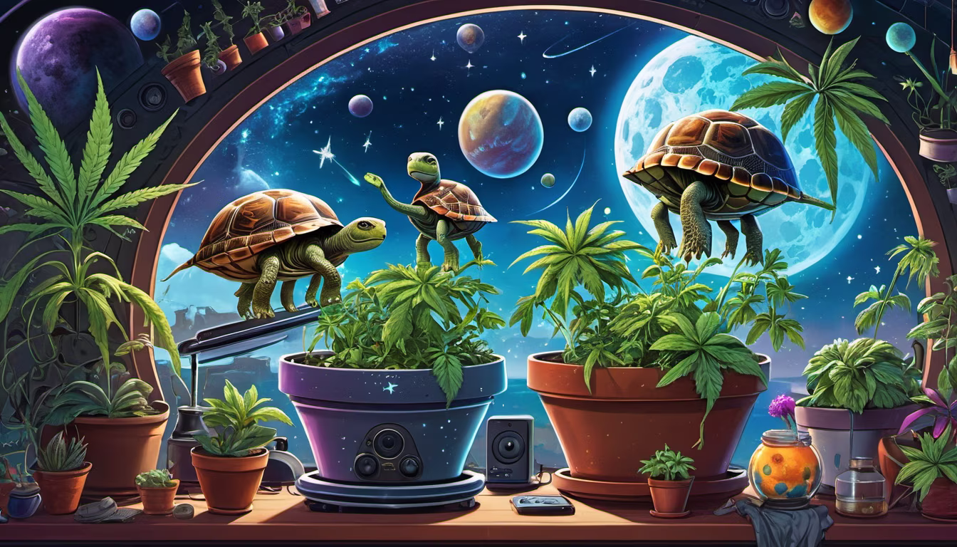 Prompt: stereo, music bass subwoofers, beautiful marijuana plants growing in pots, the sky is open because the roof is missing showing the stars moons planets hd 3d 32k amazing decor with ghosts making smoothies in the kitchen, there is a bunch of turtles