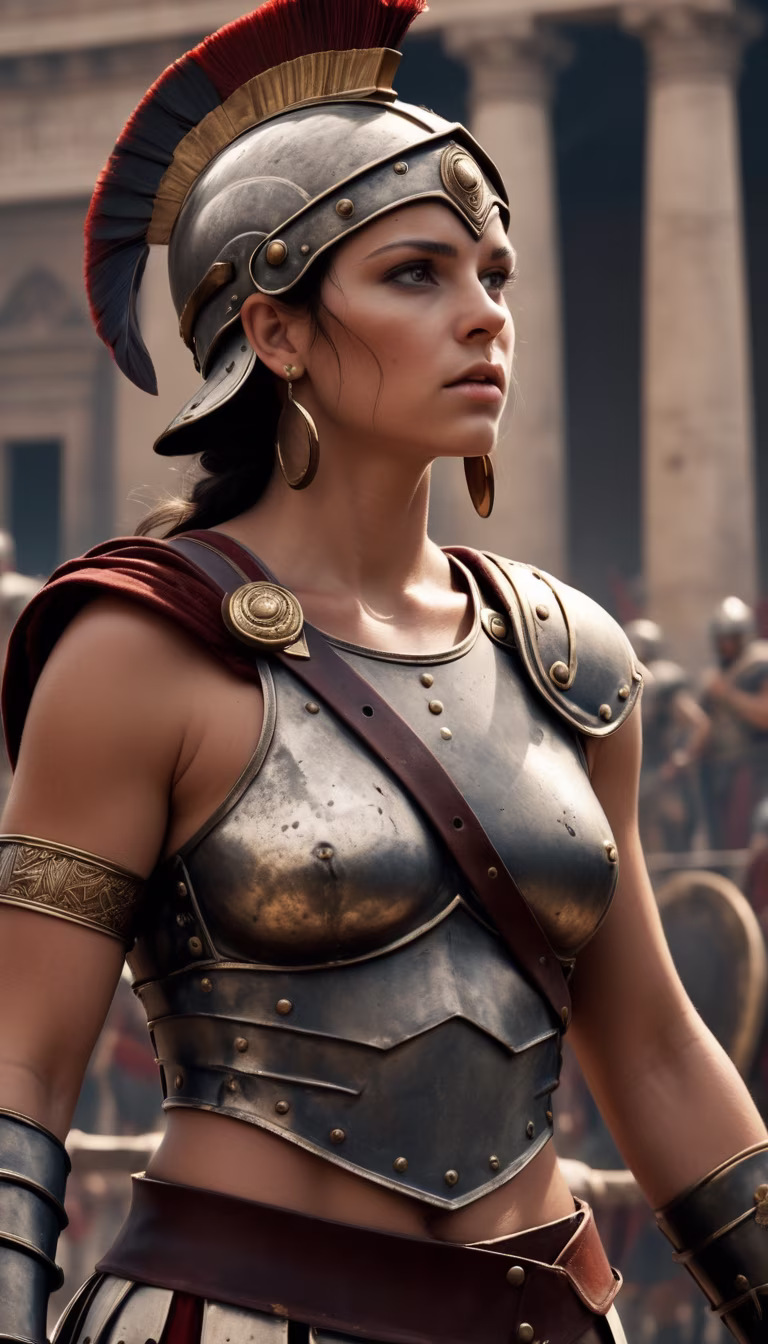 Prompt: Zachary Edward Film style, film grainy, best quality, Master masterpiece, Ancient Rome 69 BC, close-up of a female gladiator, earings, epitome of beauty, Dirty slave,huge breasts ,combat stance, in the gladiator ring, dark tone, cinematography, super Detail, Ultra HD, 16k