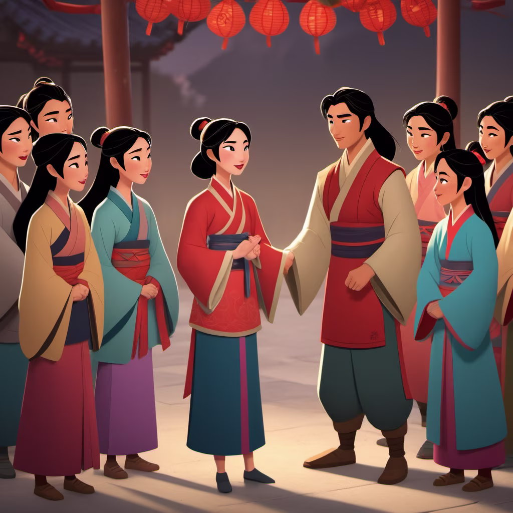 Prompt: The villagers unite, offering seamless support to Mulan, creating a harmonious scene of solidarity,