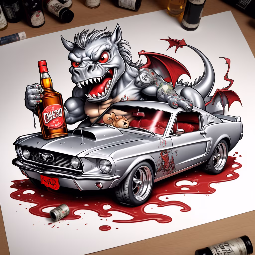 Prompt: comic cartoon caricature, silver Mustang GT car, angry, dragon tattooed on the hood, bottle of Red label whiskey with teddy bear all torn up and dirty in the other hand, art style by artist Cheo, high definition and details, 4k, for print shirt