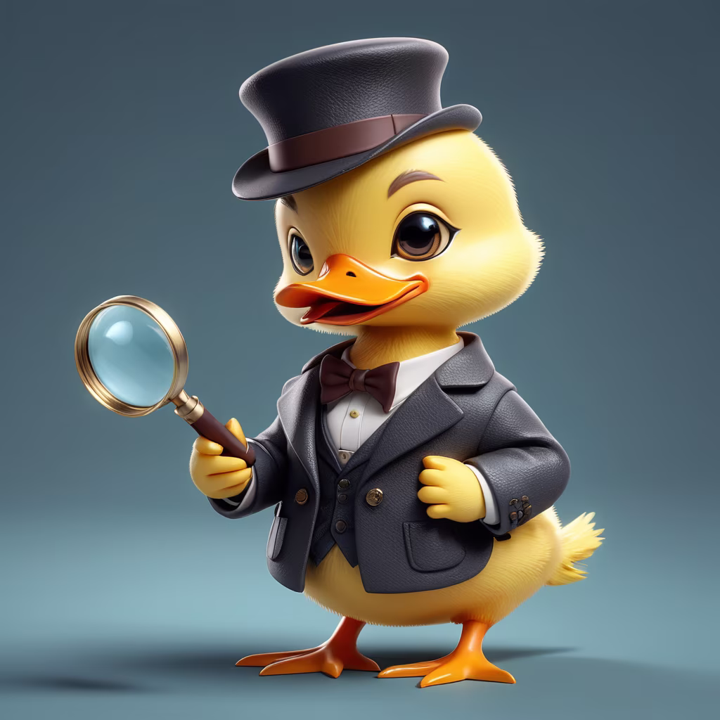 Prompt: 3D anime style, cute yellow fuzzy duckling, wearing a Sherlock Holmes style detective outfit, monocle, holding a magnifying glass, smoking pipe in beak, looking for clues to solve a mystery