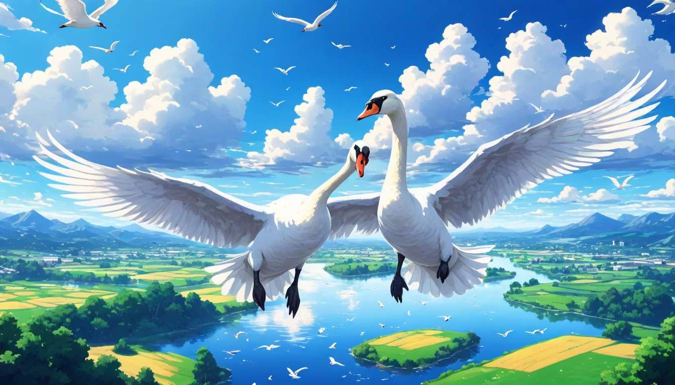 Prompt: Swans flying in the sky, with a backdrop of azure sky and a vast expanse of scenery, high-quality, masterpiece negative_prompt: multi-headed, multi-winged