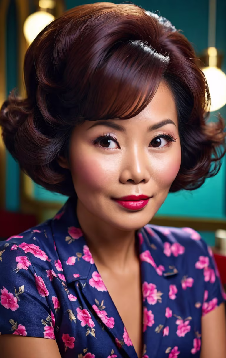 Prompt: Year:1960. High detail, Canon EOS DSLR photograph. UHD, 8K resolution, sharp focus, full color, close up, intimate, candid headshot portrait of a sultry, age 35 Vietnamese wife seated in a brightly illuminated beauty salon in 1960, showcasing all of her new hairstyle. (high view:1.5) She looks up demurely at you. Her thick, mid-length, softly textured hair is expertly styled in a precisely arranged, alluring contemporary lofty bouffant with thick luxuriant bangs. She is casually attired. Accurate 1960 styling.
