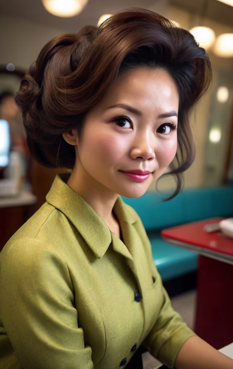 Prompt: Year:1960. High detail, Canon EOS DSLR photograph. UHD, 8K resolution, sharp focus, full color, close up, intimate, candid headshot portrait of a sultry, age 35 Vietnamese wife seated in a brightly illuminated beauty salon in 1960, showcasing all of her new hairstyle. (high view:1.5) She looks up demurely at you. Her thick, mid-length, softly textured hair is expertly styled in a precisely arranged, alluring contemporary lofty and voluminous bouffant updo. She is casually attired. Accurate 1960 styling.