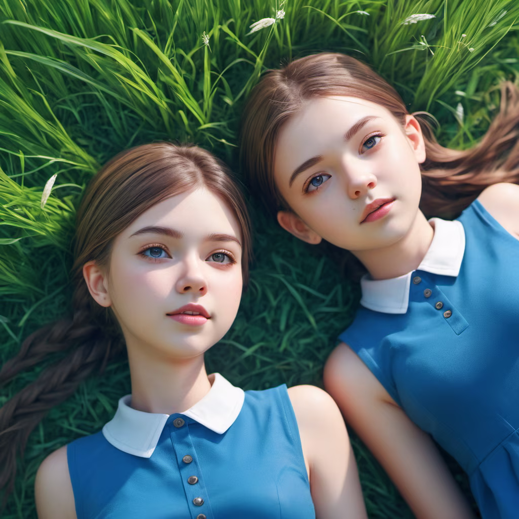 Prompt: Grass. Two bottles of drinks of the same size are lying on the grass. There are small flowers scattered around. Commercial photography. Top view. Central composition.