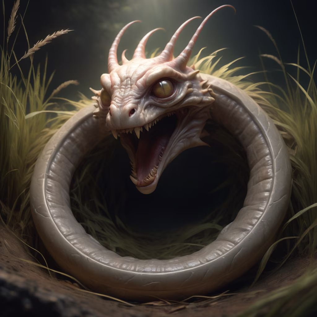 Prompt: realistic ouroboros, tall grass, Rembrandt light, Richard Schmid hyperrealistic, subtle mist, dramatic chiaroscuro, 4K masterpiece