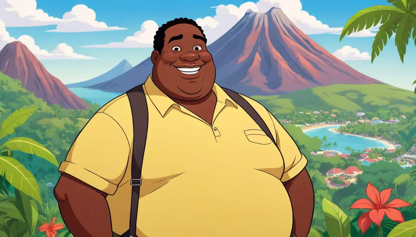 Prompt: Disney cartoon style obese Jamaican man smiling facing us, there is a Jamaican landscape with a volcano in the background