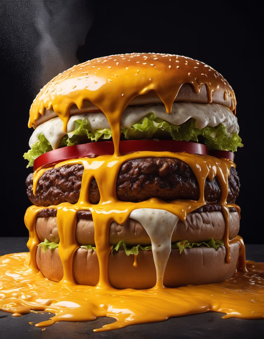 Prompt: A giant cheeseburger, made of melted cheese, oozing out of a styrofoam burger box. The bun is soaked in the cheese and starting to fall apart. The cheese is glowing with an intense heat, and there are steam rising off of it. The cheese is slowly dripping down the side of the box, leaving a trail of melted cheese on the floor