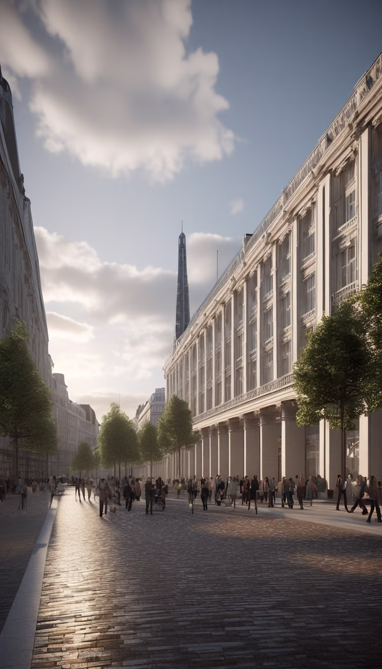 Prompt: A CGI Urban render, Render group, People walking, Magnificent buildings, glorious atmosphere, public space