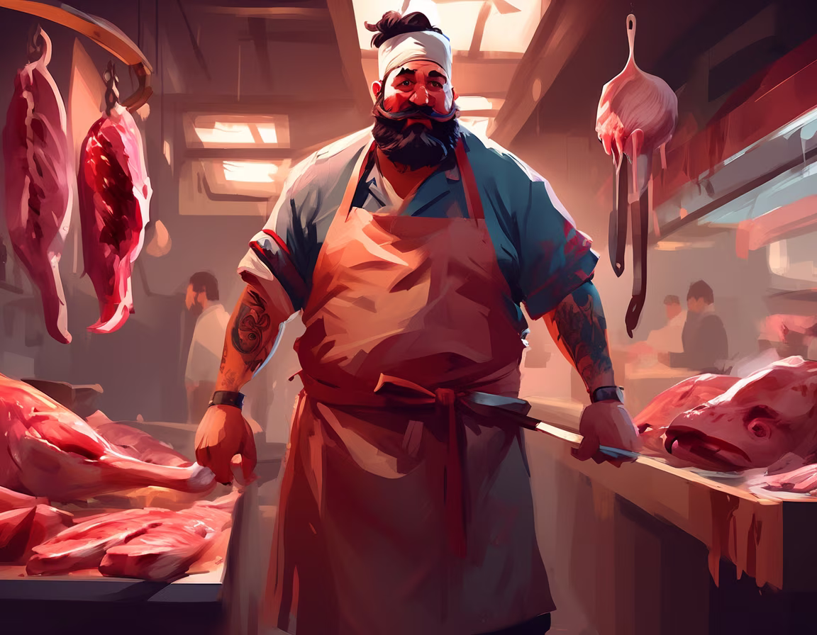 Prompt: cinematic concept art by [tyler jacobson|loish van baarle|sparth], abstract illustration, of a butcher wearing traditional francoarabesque clothing and butchering a monster. powerful. chubby buff. tattoos. mustache.