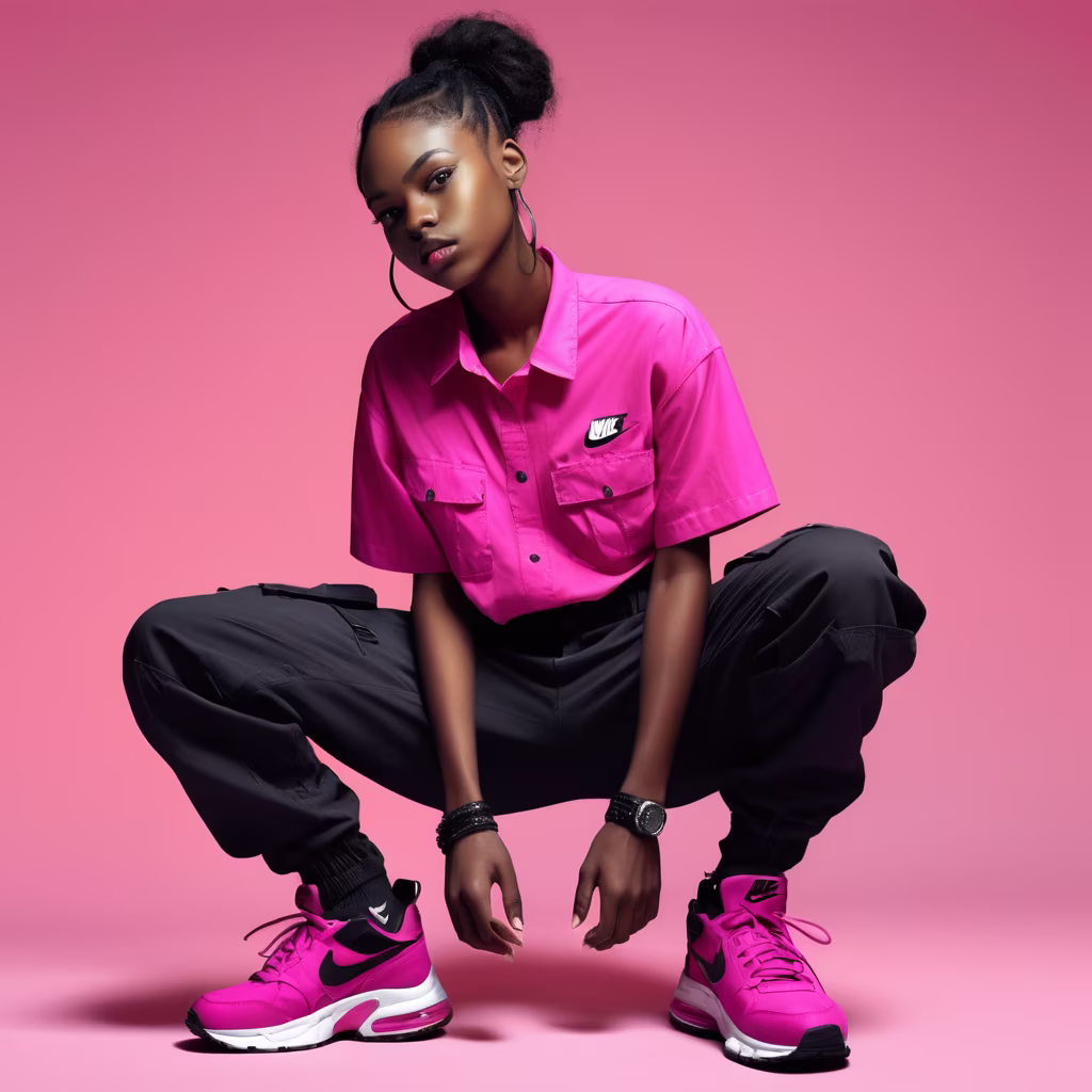 Prompt: young african black model on hotpink shirt and black cargo pants with Nike shoes hyperealistic
