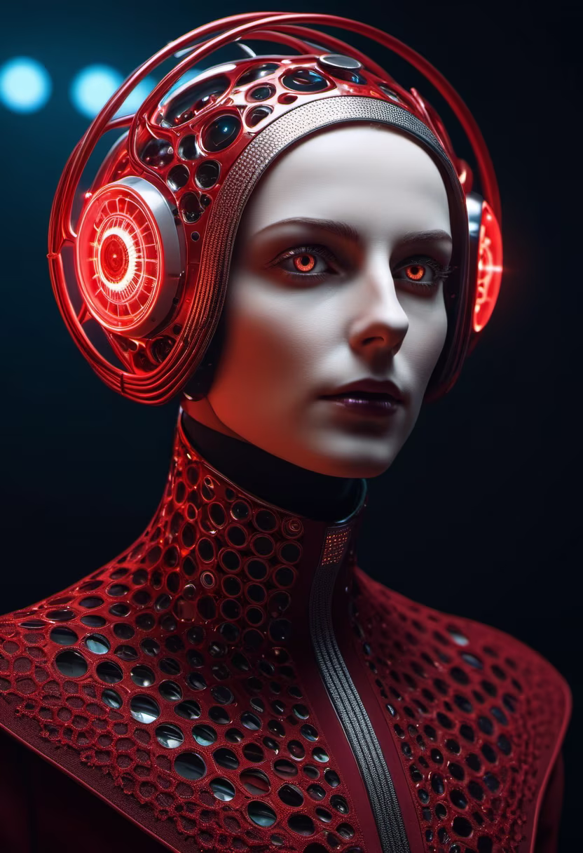 Prompt: Robotic humanoid full body formed entirely by white spirograph vortex of Fibanacci sequence with complex topology of glowing nodal RGB light network dark deep by anton semenov hussar focused lighting in space ship control room deep red ((robotic face)) Russ Mills