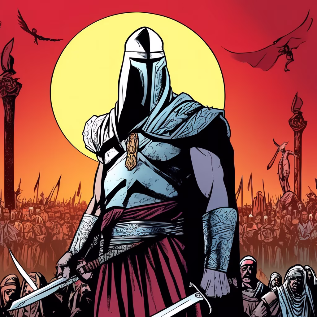 Prompt: Intense 4K illustration of Saladin launching a decisive attack, commanding his army with strategic brilliance, dynamic composition capturing the chaos of battle, detailed soldiers engaged in combat, dusty battlefield with hints of war-torn landscapes, Leica 50mm lens for individual expressions, ISO 400 for optimal exposure, dramatic lighting to enhance the impact, film grain for authenticity