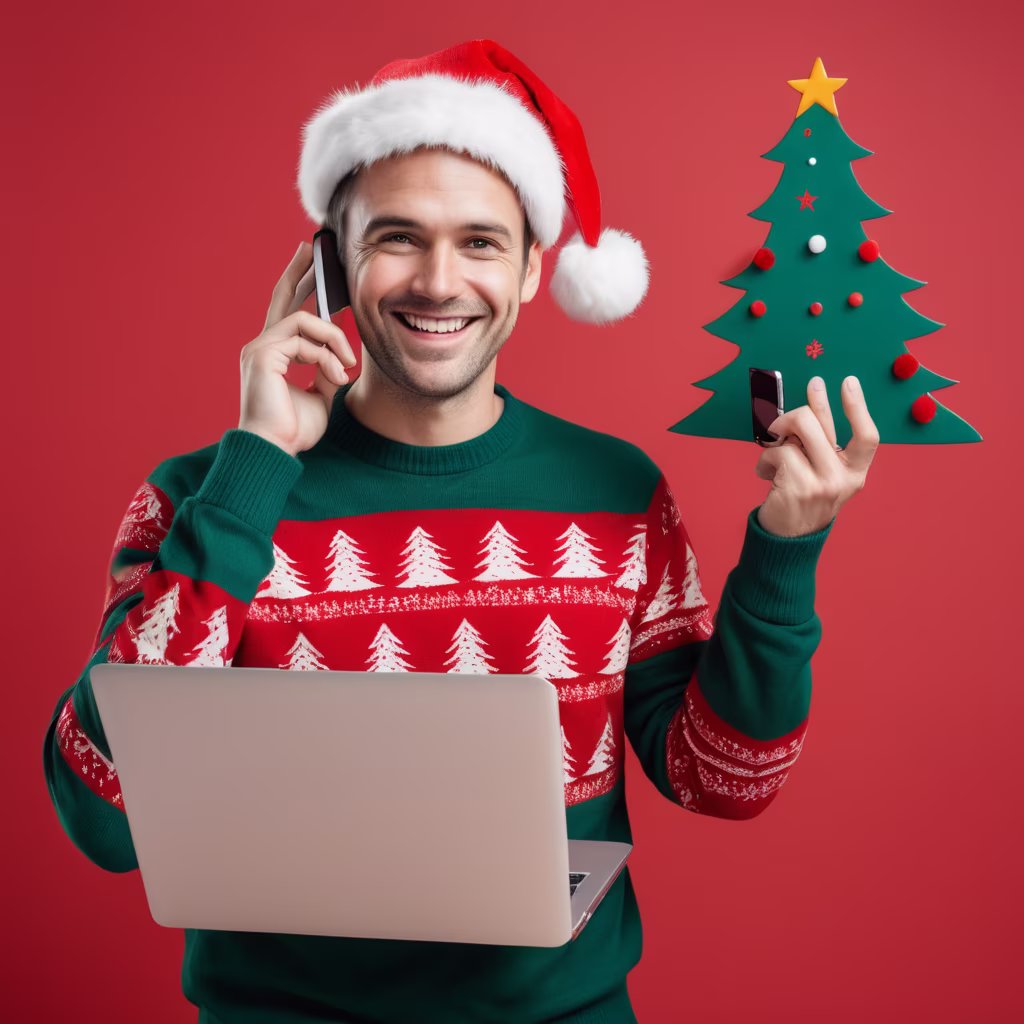 Prompt: In the image, there is a man against a red background. He is wearing a festive Christmas sweater that's primarily red with a pattern that includes what appears to be a Christmas tree design. On his head, he has a Santa Claus hat, complete with a white fur trim and a pompom. He is smiling broadly, showing a sense of joy and warmth. In his left hand, he is holding an open laptop, suggesting he might be working or ready to communicate with someone online. With his right hand, he is holding a cellphone to his ear, indicating he is in the middle of a conversation. His attire and the gadgets suggest a casual and cheerful approach to work during the holiday season.