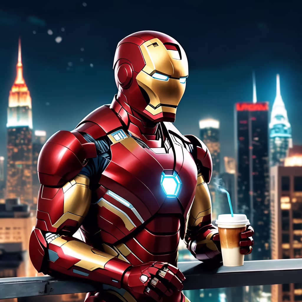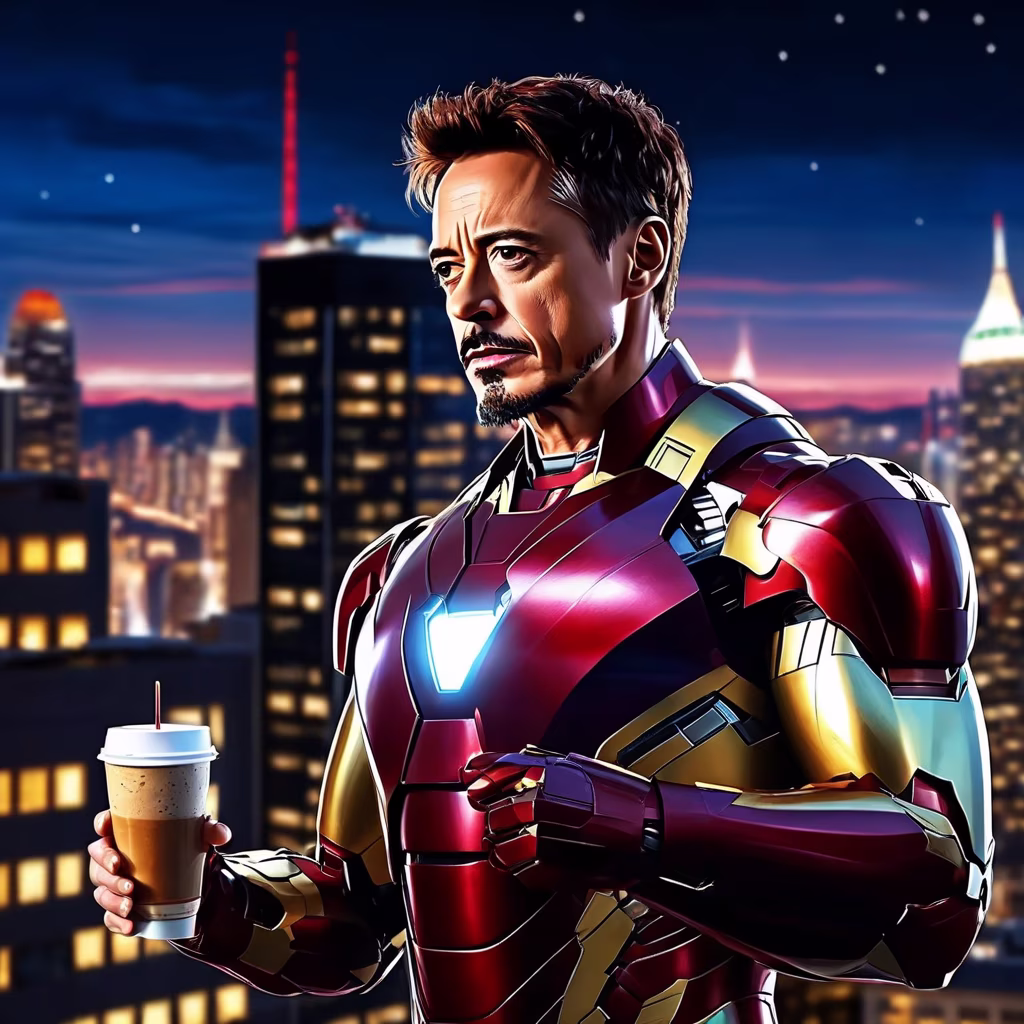 Prompt: tony stark (iron man) without mask on a rooftop sipping coffee, skyscraper background, night scene, ultra detailed, realistic