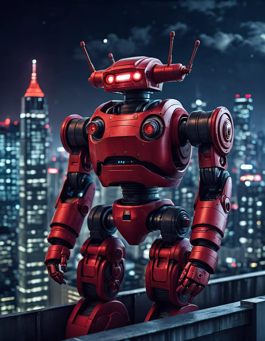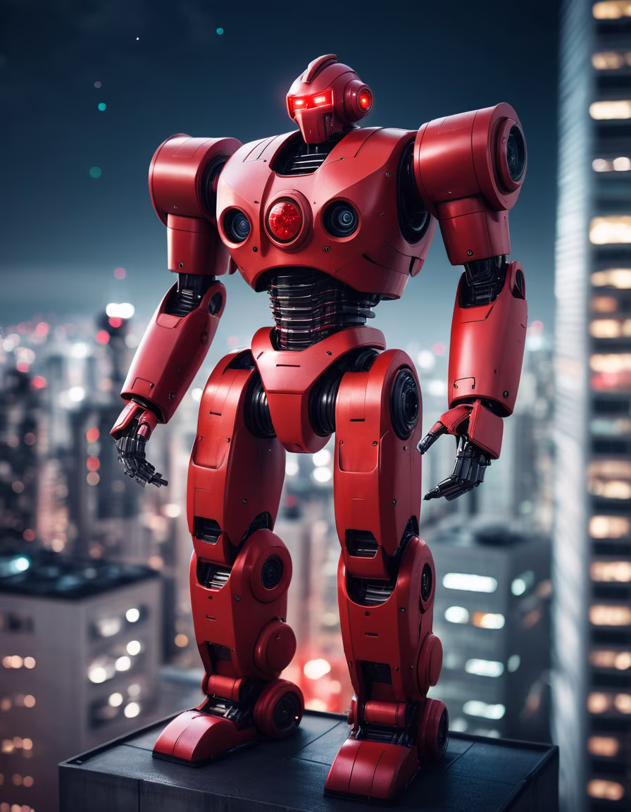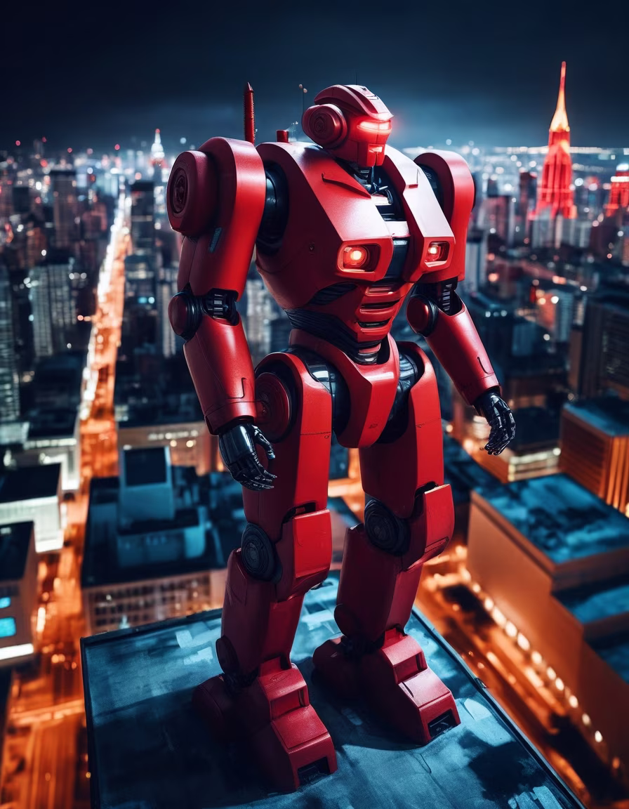 Prompt: a giant red robot standing on the roof of a building looks out over the futuristic city around him at night