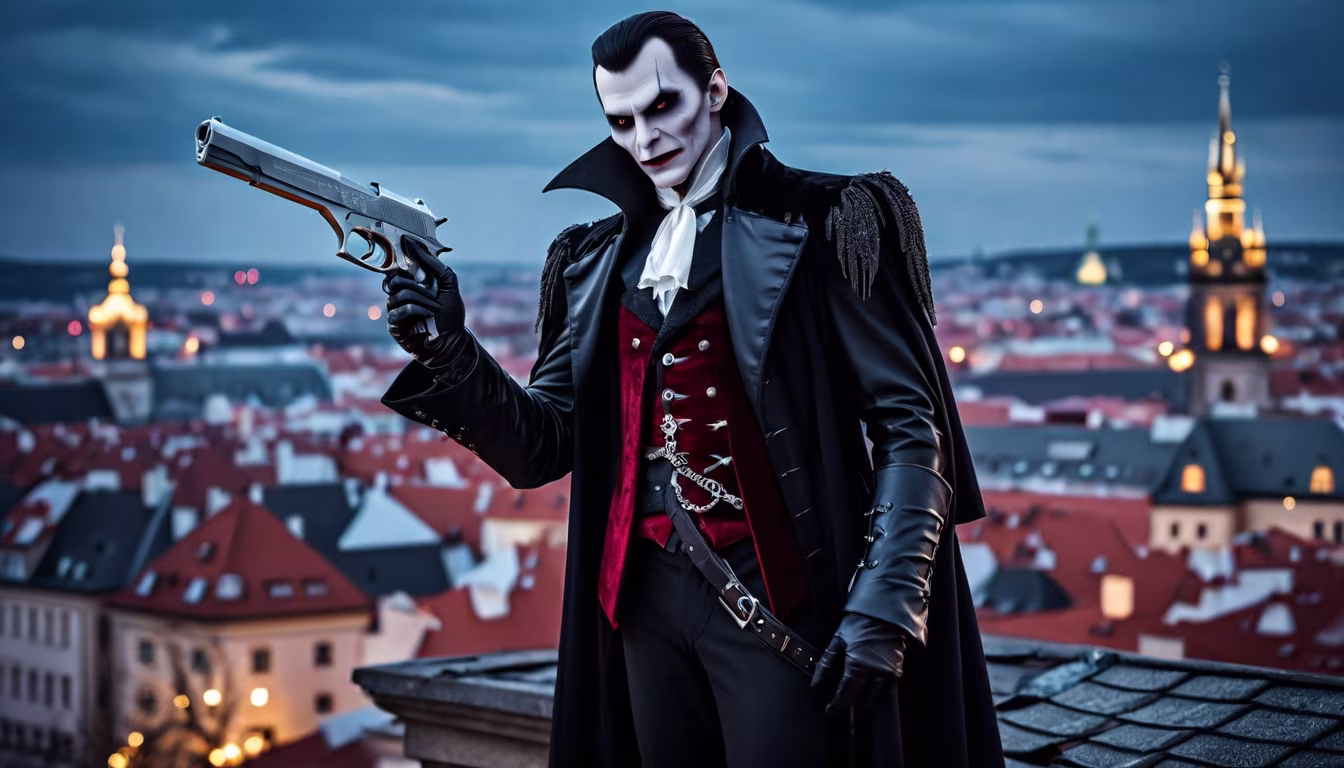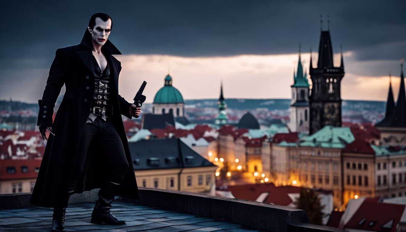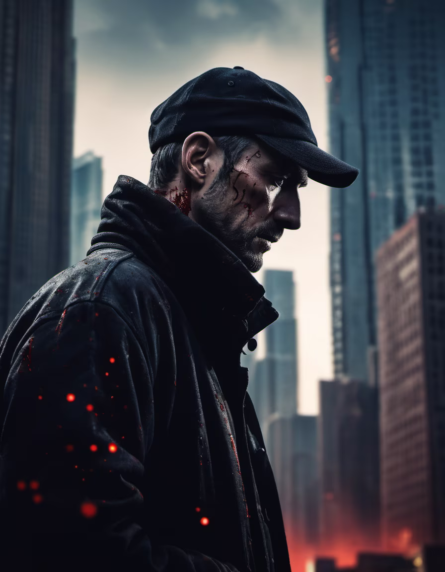 Prompt: A world-weary man, gun in hand, blood trickling down his head, stands in silhouette beneath the towering buildings of the crime-ridden city.