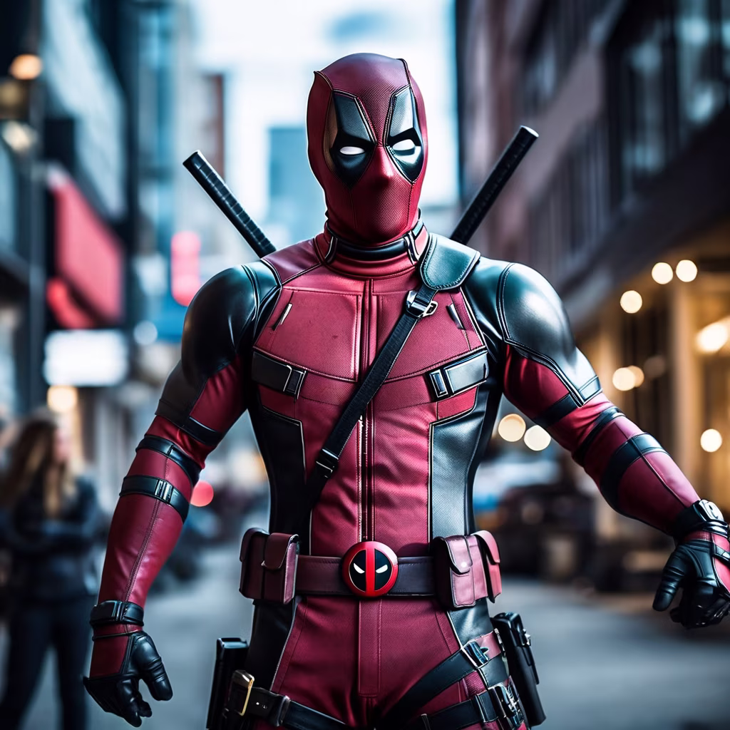 Prompt: Realistic photo of Deadpool sitting on a roof, the city in the background, it's almost nighttime, high quality, ultra detailed, 4k