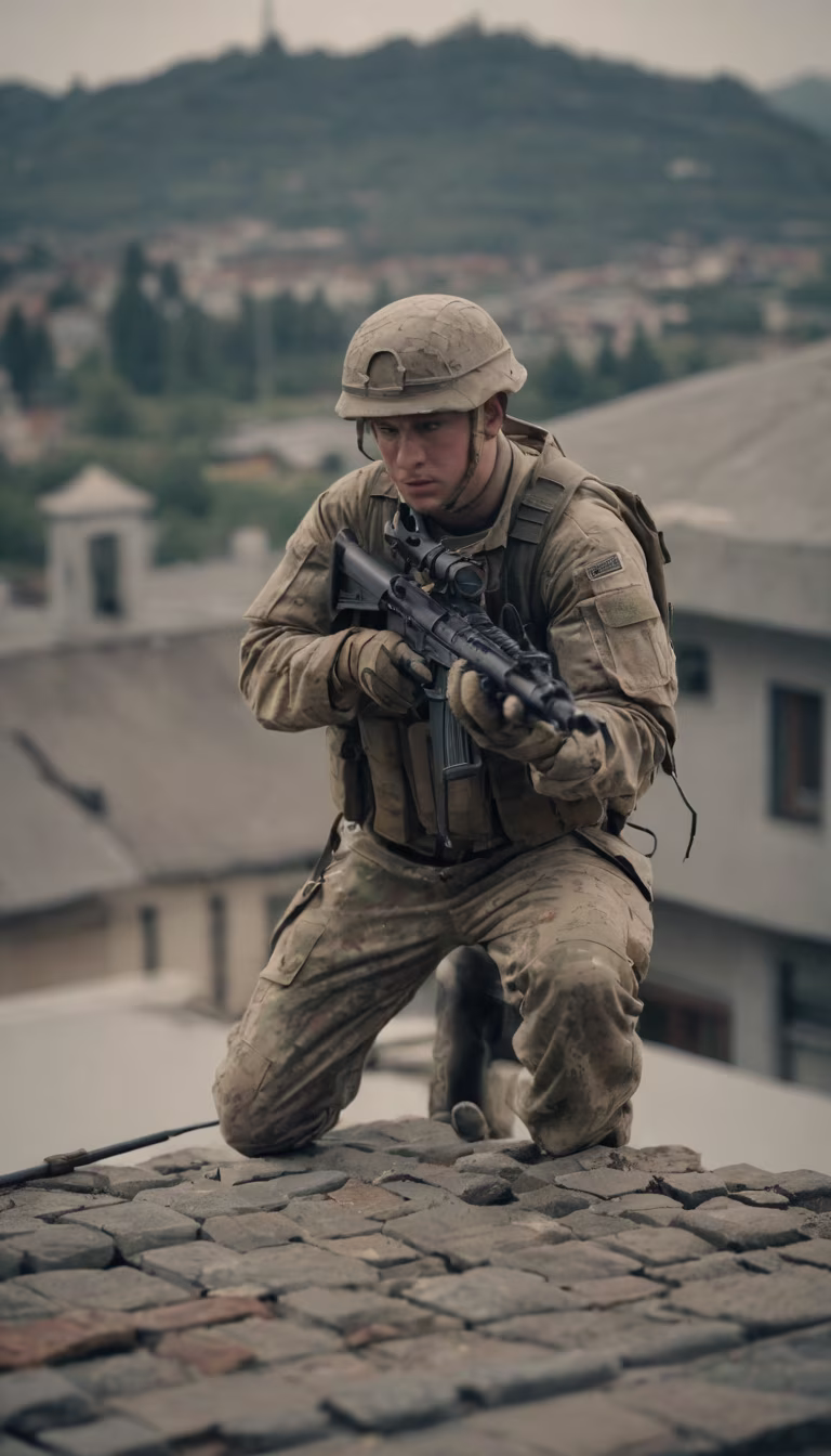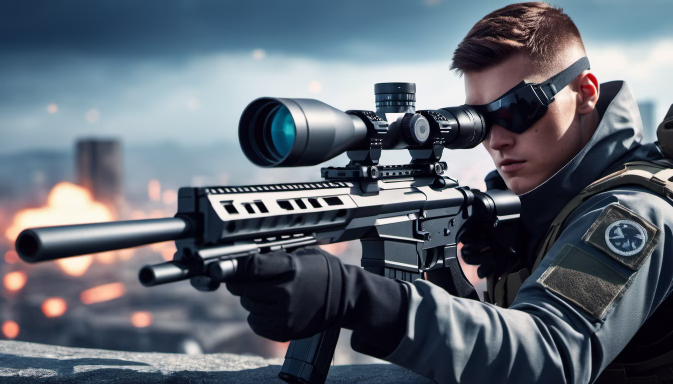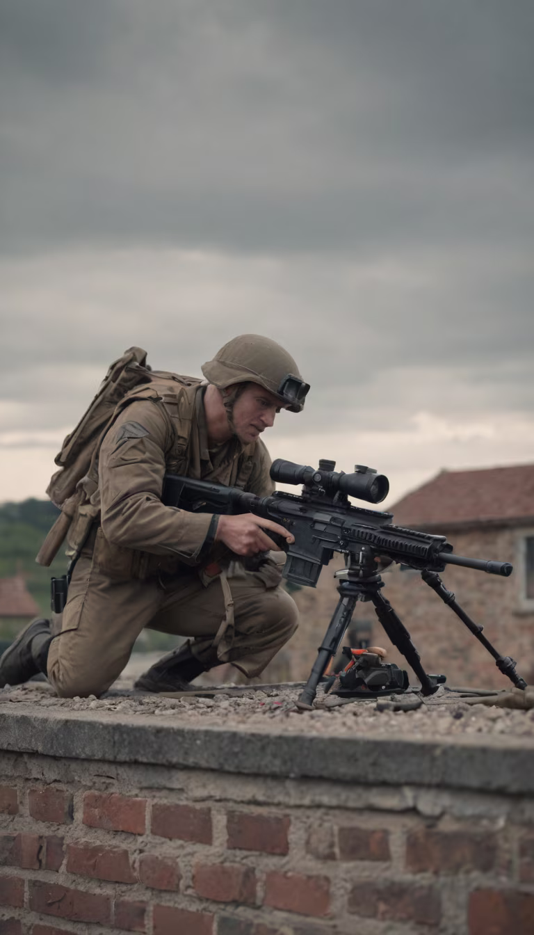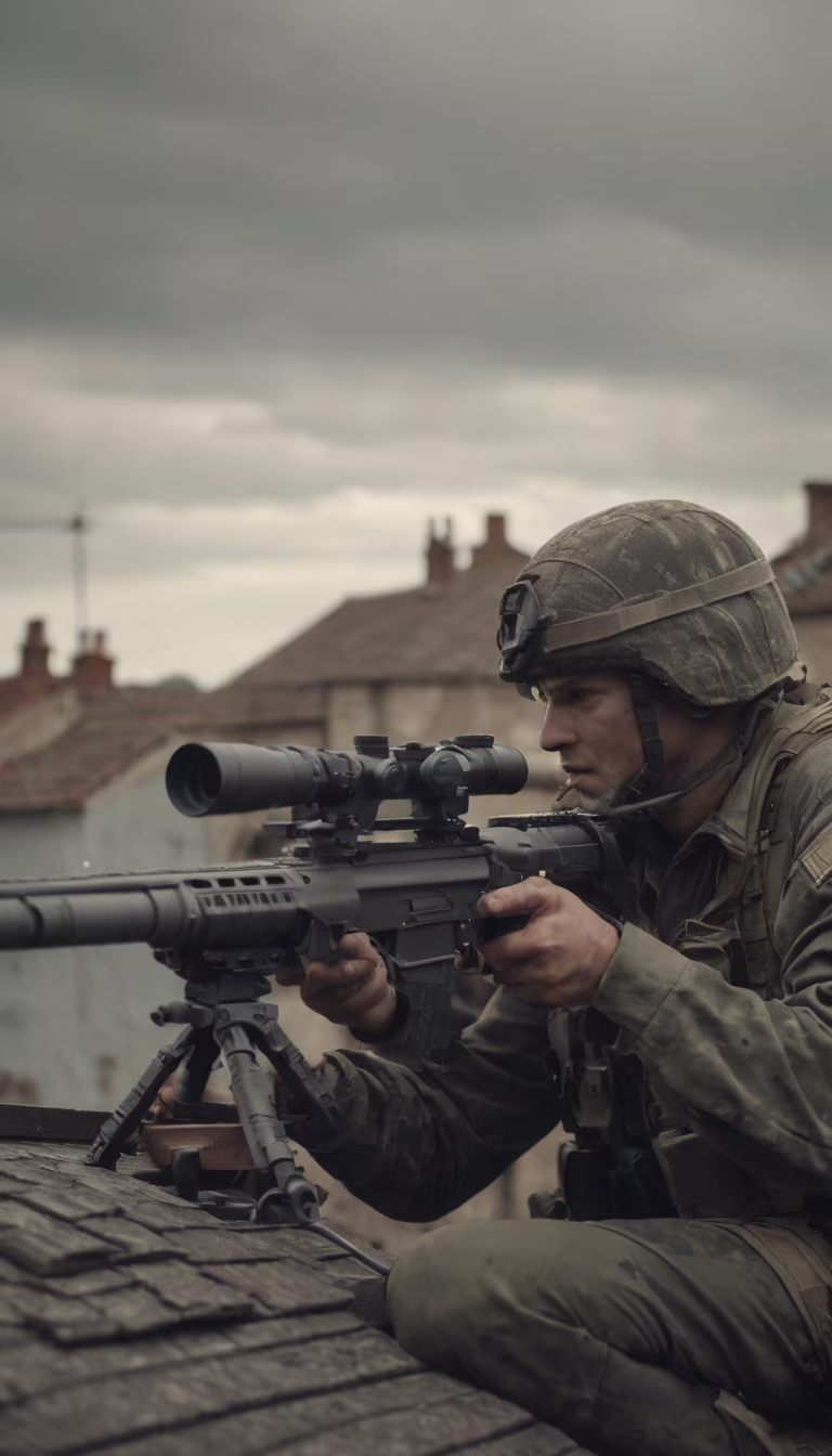Prompt: cinematic shot of a cyborg sniper, massive futuristic sniper gun overlooking a chaotic battleground