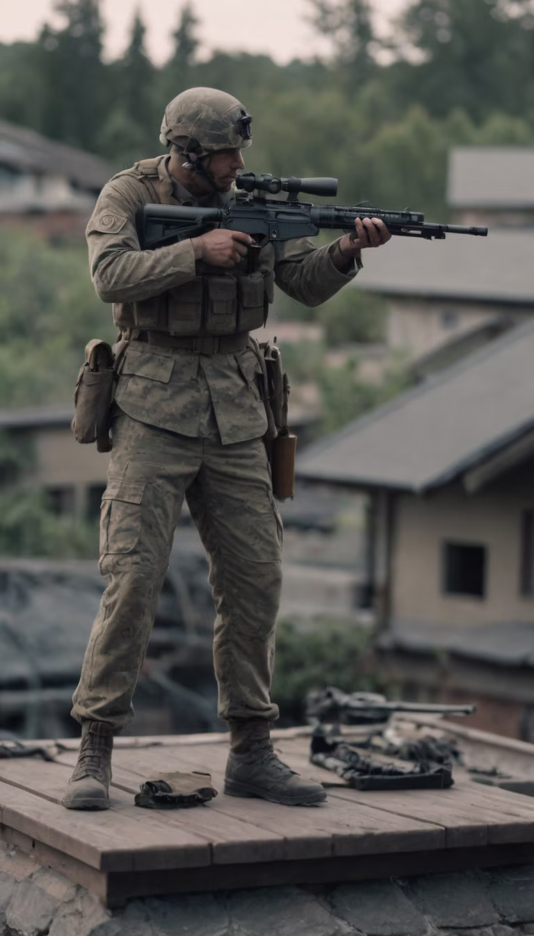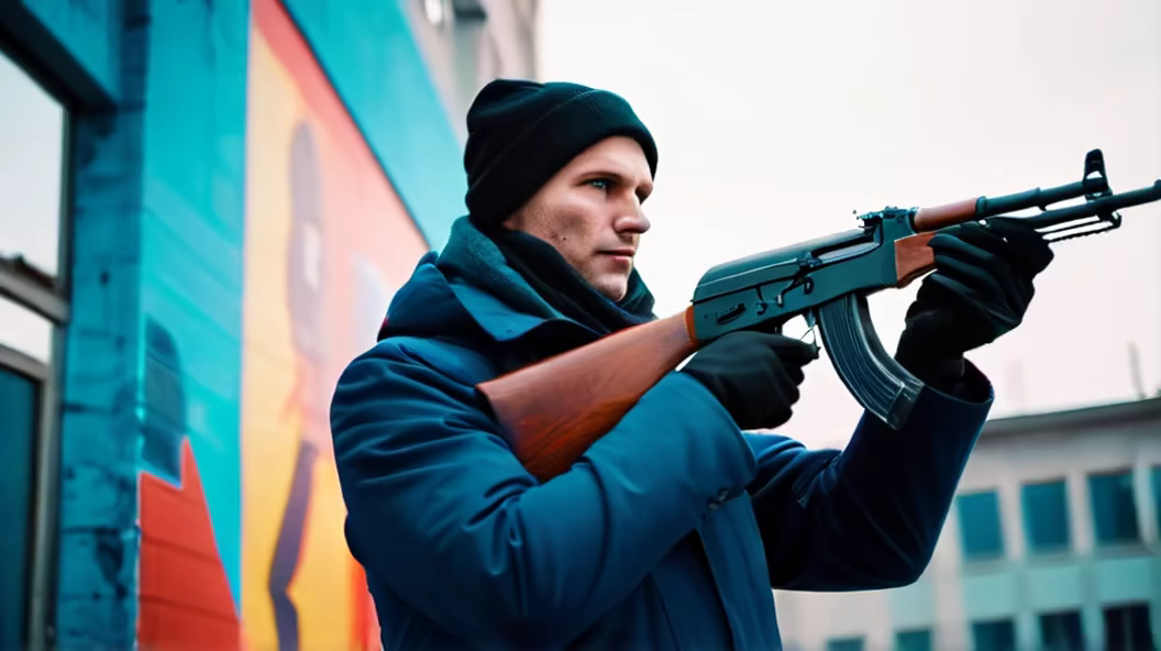 Prompt: a post soviet apocolypse survivor pointing an AK47 at a building. Colorful, vivid, cinematic