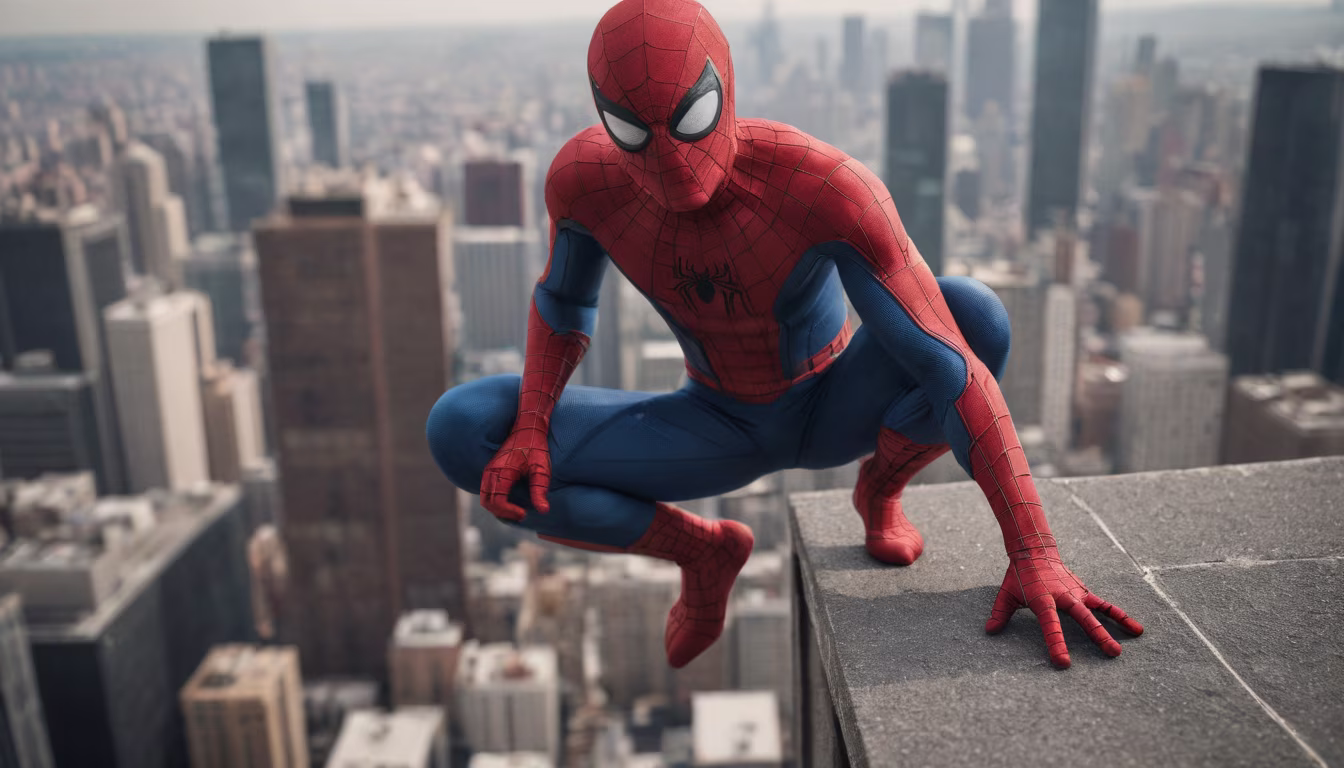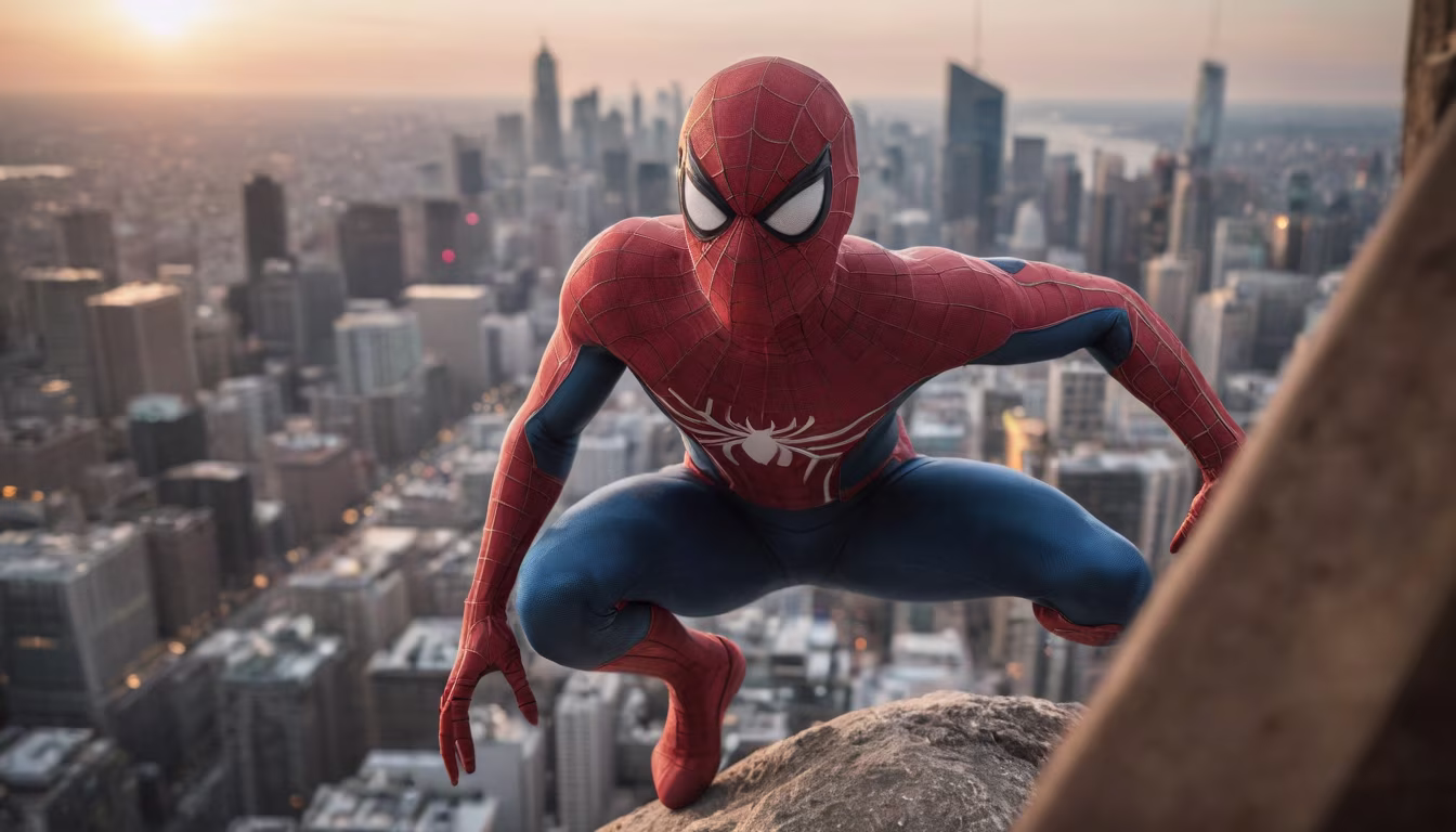 Prompt: stunning view of a man in spider man suit face revealed climbing buildings