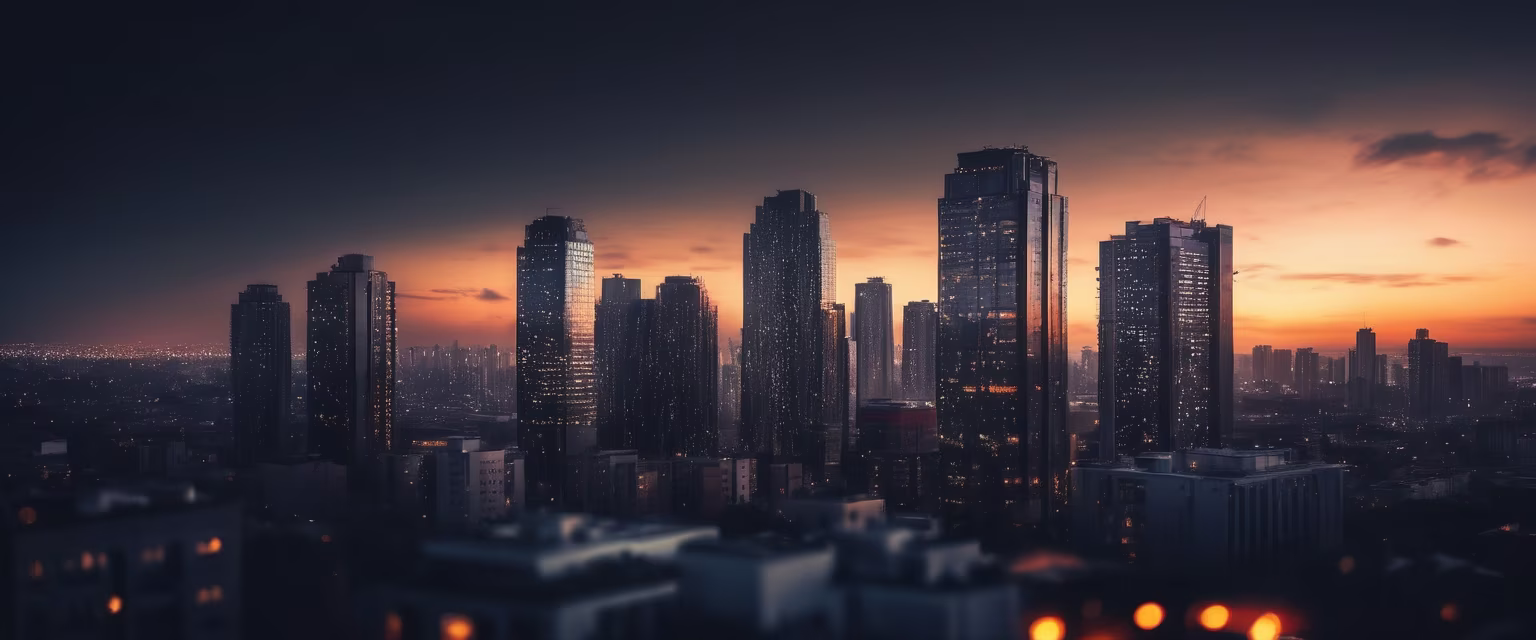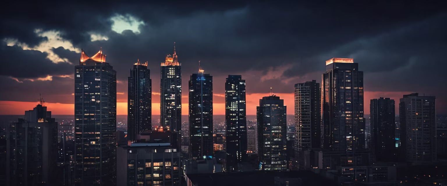 Prompt: a clear dark sky, sunset, high rise buildings, , moody, detailed, high quality